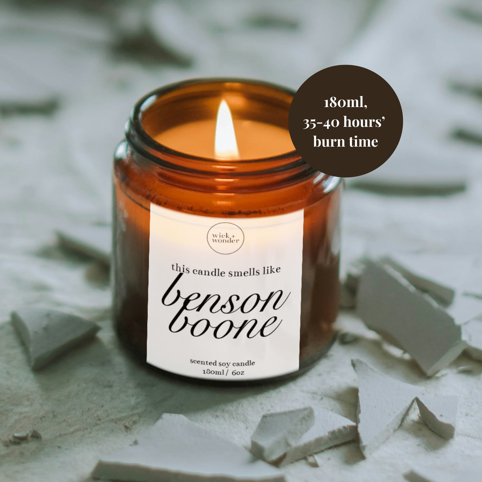 Indulge your fandom wit this 'Smells Like Benson Boone Candle'. This super fun Benson Boone gift is made with soy wax and luxury fragrance, and features a beautiful, surprise scent inspired by the music icon. You have 2 sizes to choose from: a 120ml clear glass jar candle, or a 180ml amber glass jar candle. Both have a lid closure, and a hand-drawn illustration, for a super-stylish finish.