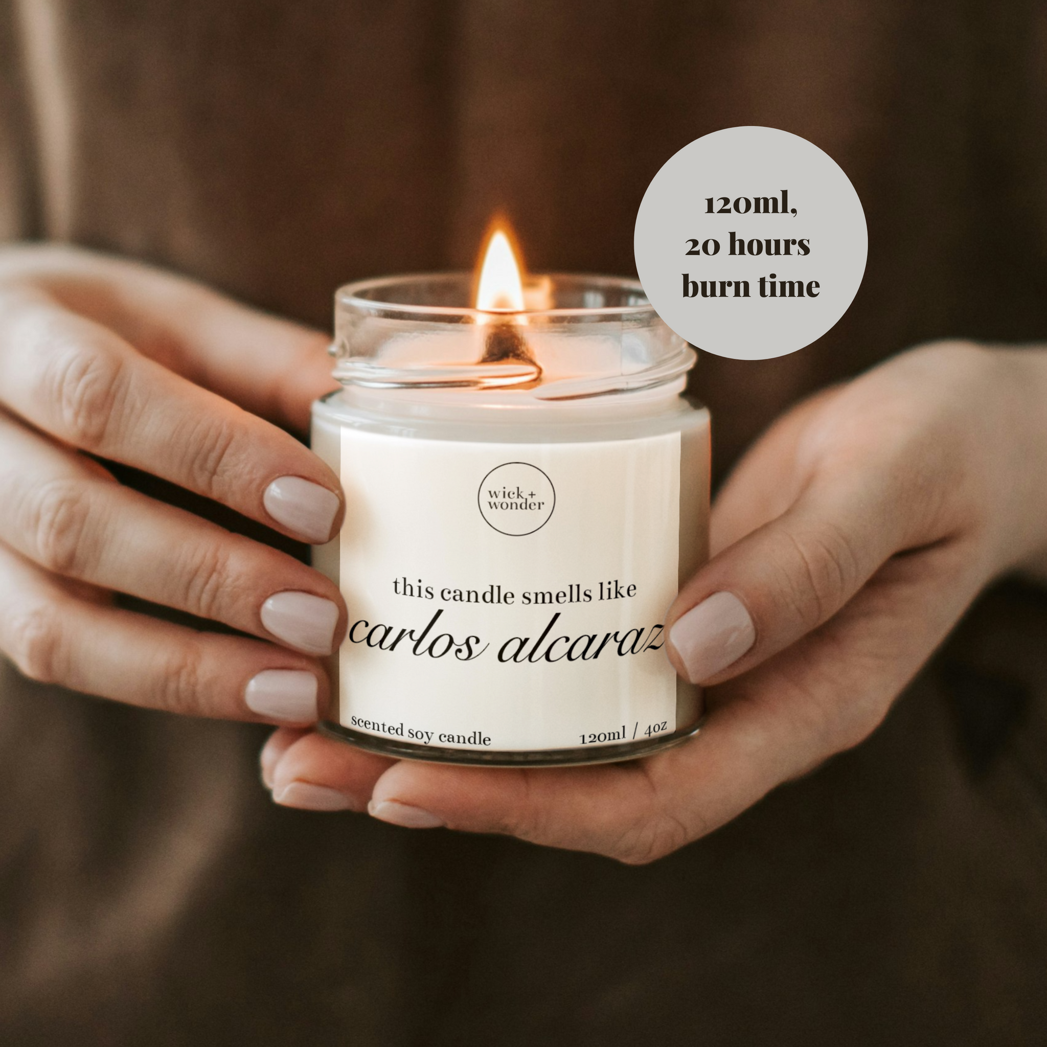 This 'Smells Like Carlos Alcaraz Candle' is made with tennis fans in mind. Handcrafted with soy wax and luxury fragrance, our Carlos Alcaraz candle features a gorgeous, mystery scent inspired by the tennis superstar. This makes a super fun tennis gift for any occasion – and is great for burning while watching a match.